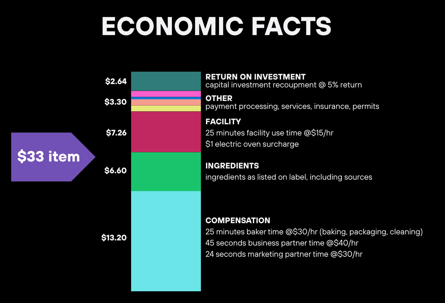 Every product in the service carries an Economic Facts label alongside the standard Nutrition Facts label. It shows, in plain terms, what you actually paid for: compensation, ingredients, facility use, infrastructure, and what's going toward the investment that makes the system possible.